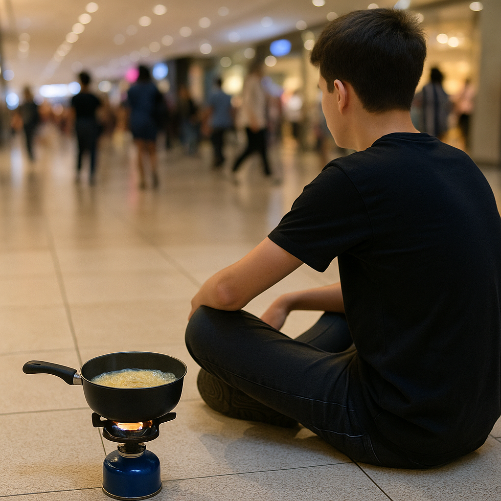 Kejadian ini terjadi di sebuah mall yang cukup populer di pusat kota. Berdasarkan keterangan saksi mata yang sempat diwawancarai beberapa media, remaja tersebut datang bersama dua temannya sambil membawa sebuah tas besar. Tidak ada yang mengira bahwa isi tas tersebut adalah kompor portable, panci kecil, dan sebungkus mi instan. Ia kemudian memilih spot yang cukup ramai, meletakkan kompor di lantai, menyiapkan panci, mengeluarkan mi instan, dan mulai memasak sambil tertawa bersama teman-temannya.